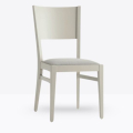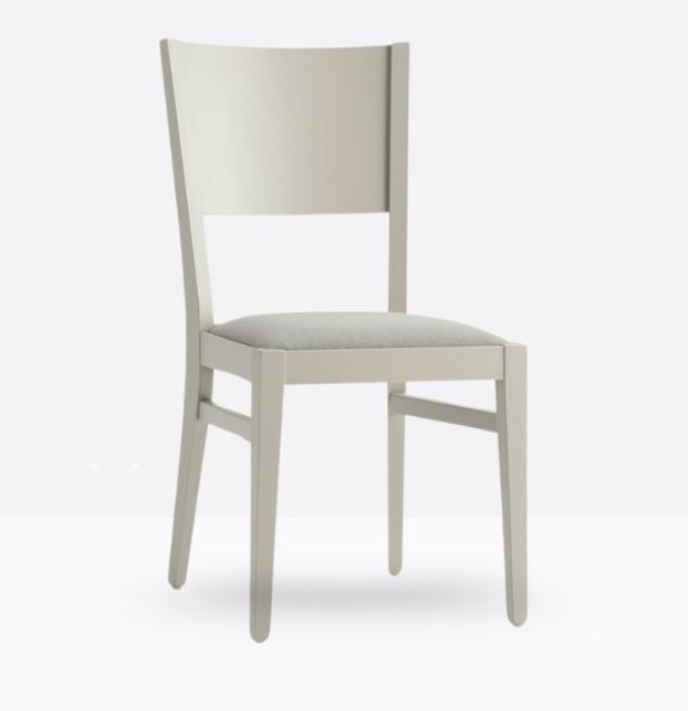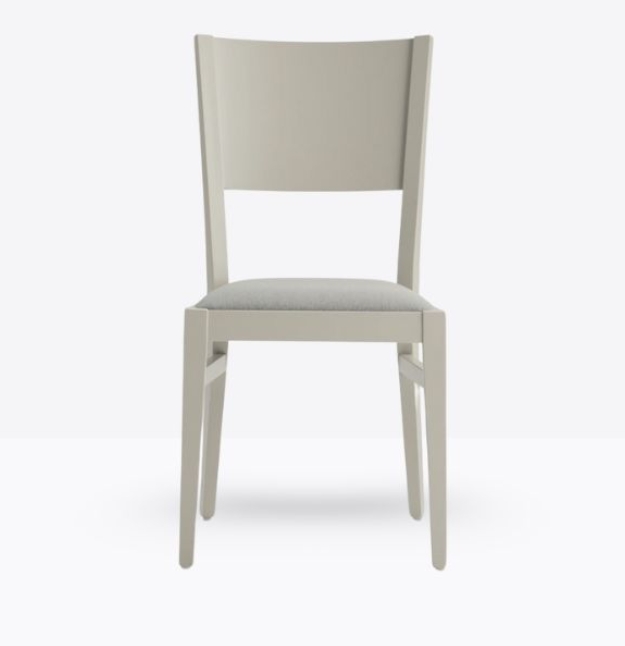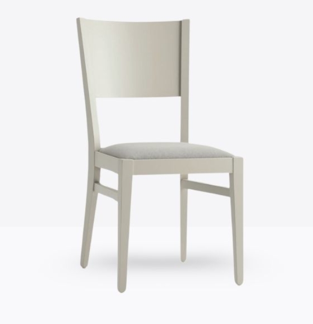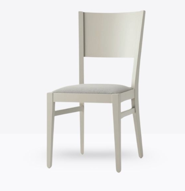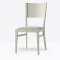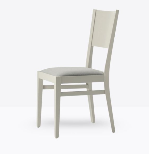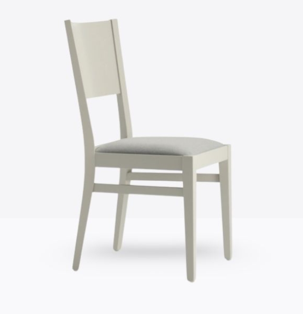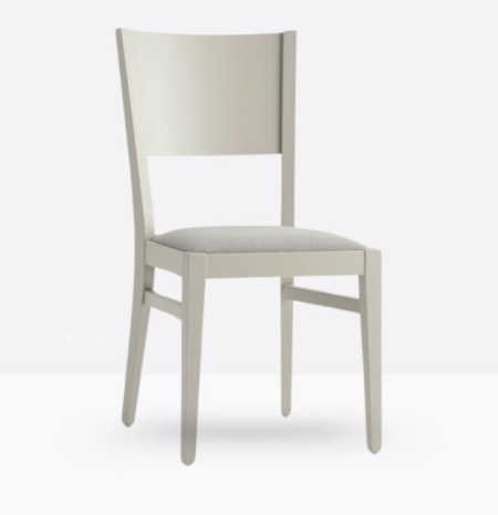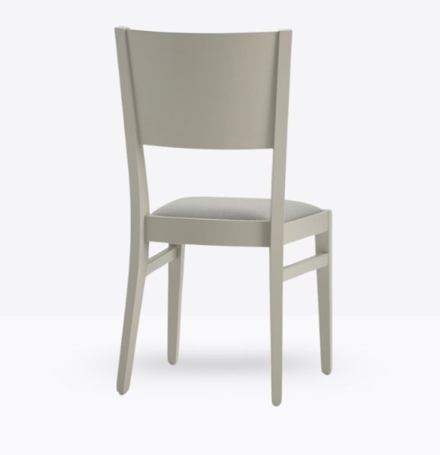 La sedia mod. 155/IMB ha una struttura in legno di faggio massello ed uno schienale in legno di faggio multistrato curvato; può essere personalizzata in tutte le tinte legno e i colori laccati visibilialla sezione finiture; la seduta è imbottita a incasso e può essere rivestita con stoffa personalizzata.