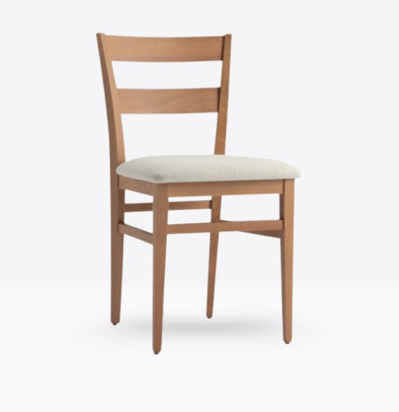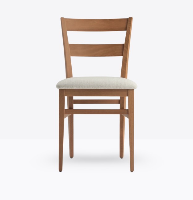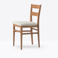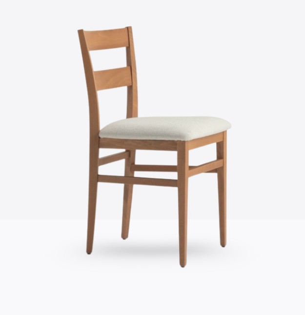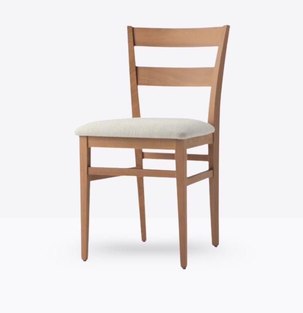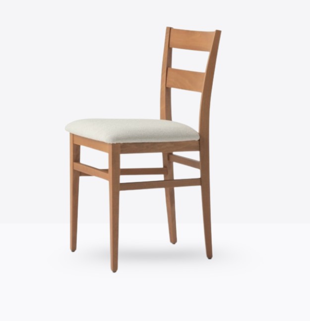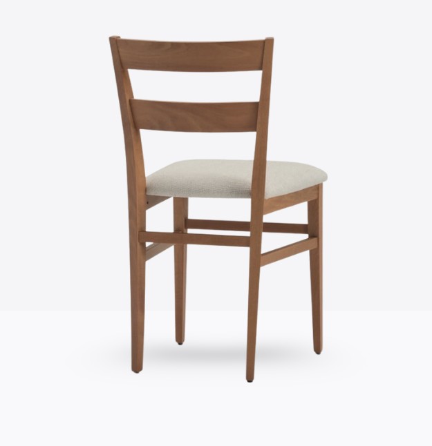 La sedia mod. 168/IMB ha una struttura ed uno schienale in legno di faggio massello; può essere personalizzata in tutte le tinte legno e i colori alla sezione finiture; la seduta è imbottita a incasso e può essere rivestita con i rivestimenti visibili alla sezione finiture.