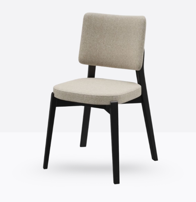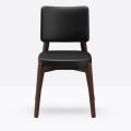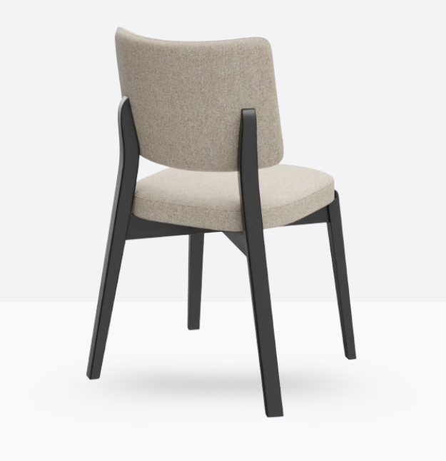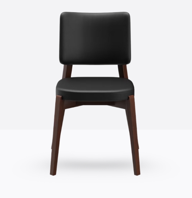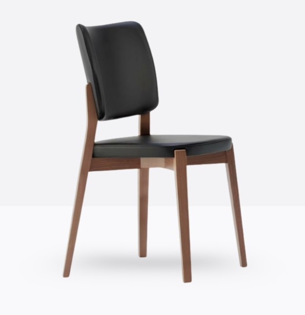 La sedia 600 ha una struttura in legno di faggio massello ed uno schienale curvato imbottito; può essere personalizzata in tutte le tinte legno e i colori visibili alla sezione Finiture.