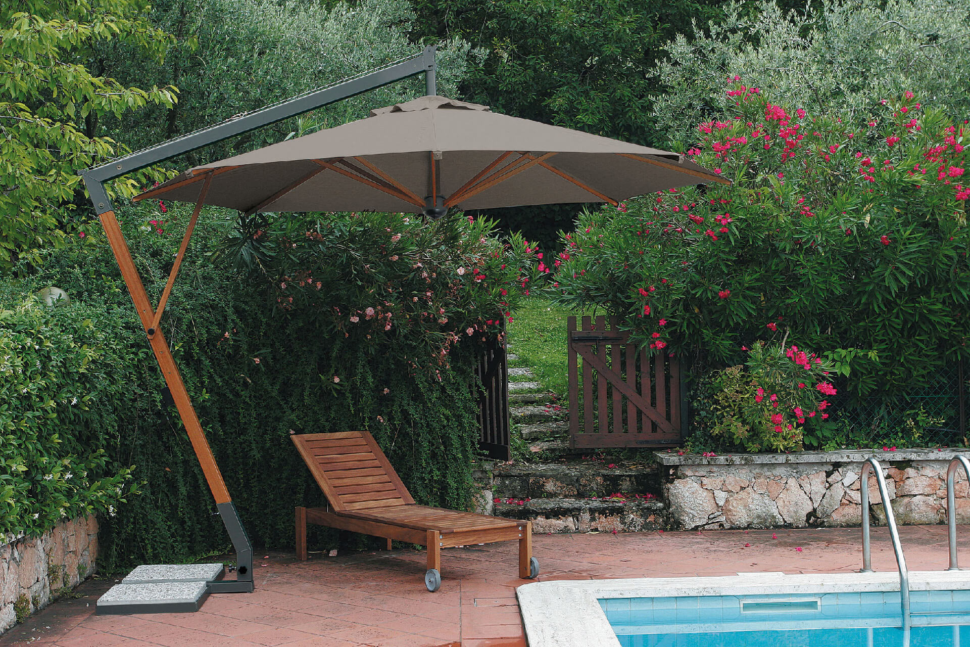 L’ombrellone mod. 6024 Un grande classico caratterizzato dall’impiego del legno. Sostegno in alluminio con finitura legno che ne migliora le prestazioni senza alterarne l’estetica. * base esclusa, fodera esclusa