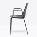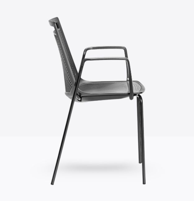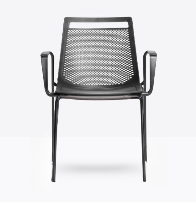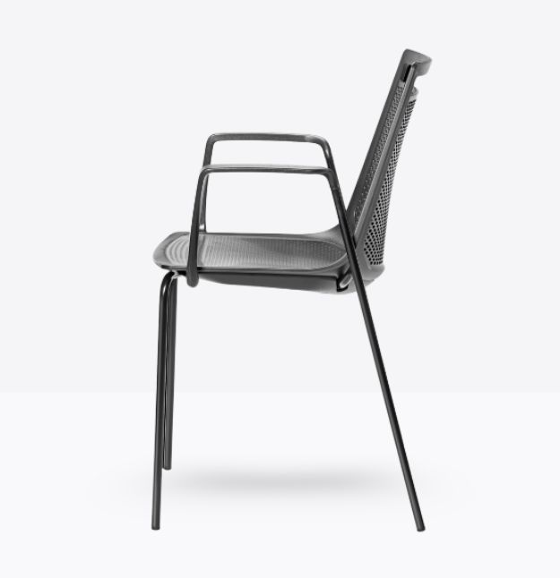 Akami TB, questa sedia ha la struttura a slitta di metallo, con la seduta a monoscocca di tecnopolimero. Quando non utilizzata può essere impilata fino a 5 unità. L’intera seduta è decorata da una fitta trama di piccoli ovali, che sul sedile sono in leggero rilievo mentre sullo schienale diventano fori