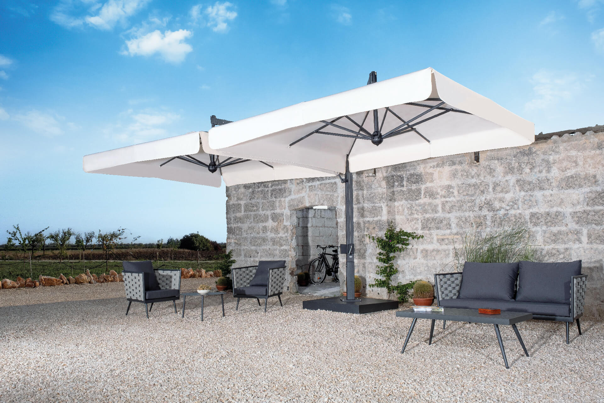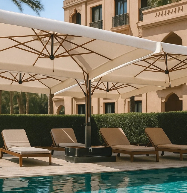 L’ombrellone Alu Poker Double con struttura modulabile in legno composta da 2 (Double) o 4 (Poker) ombrelloni ancorati ad un unico sostegno studiata per la copertura di ampie superfici con il minimo ingombro. Disponibile con nuovo sostegno verticale in alluminio con speciale finitura effetto Iroko e stecche in legno Iroko. * base esclusa