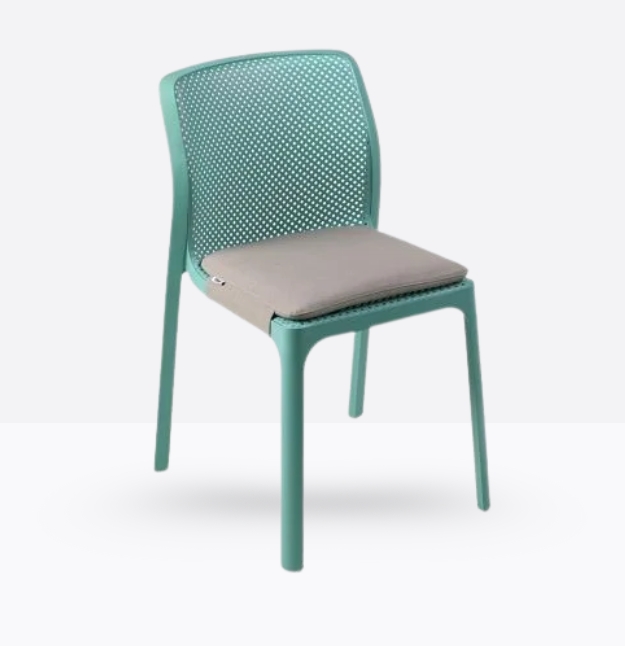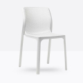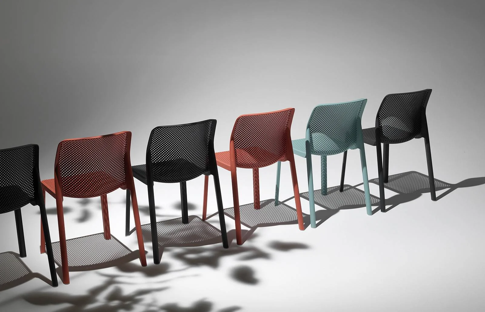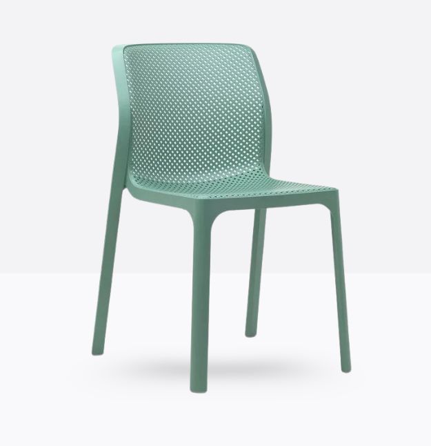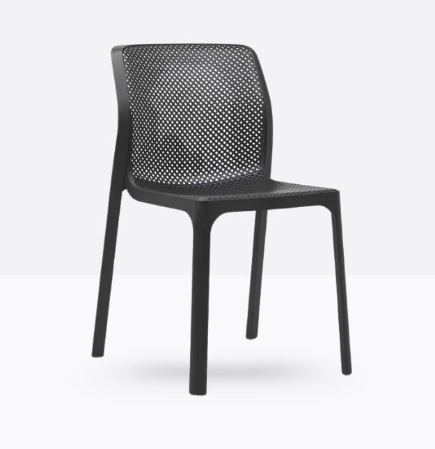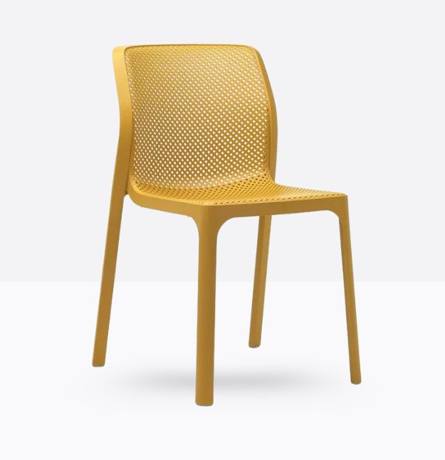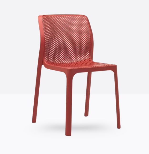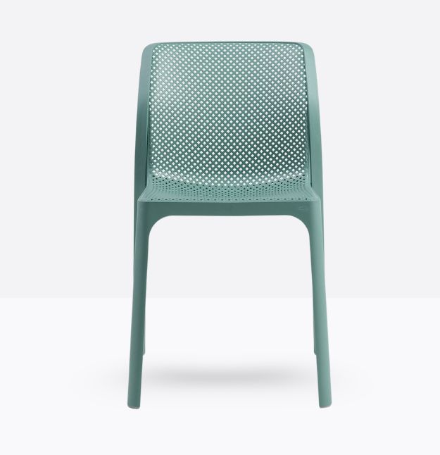 Sedia monoblocco Bit. Design raffinato e cura del dettaglio , seduta senza braccioli in resina fiberglass trattata anti-UV e colorata in massa. Design, motivo traforato e varietà di colori la rendono adatta a diversi contesti sia all’esterno che all’interno.