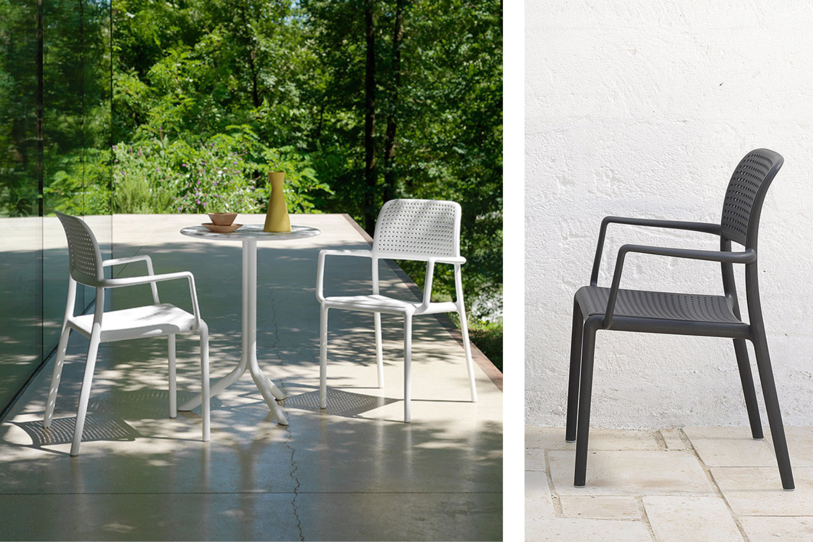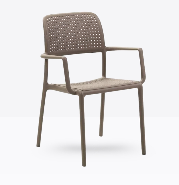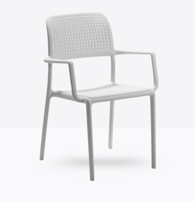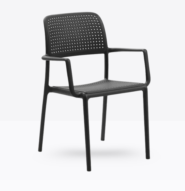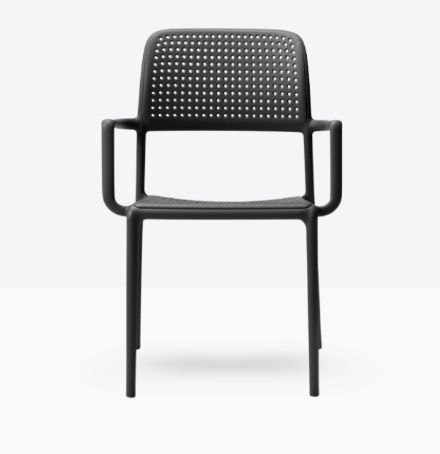 Leggera e fresca, Bora è una seduta con braccioli in resina fiberglass, con struttura tubolare continua e profili arrotondati. Seduta e schienale formano un tutt’uno evidenziando esteticamente forme che rimandano a soffici imbottiture tessili.