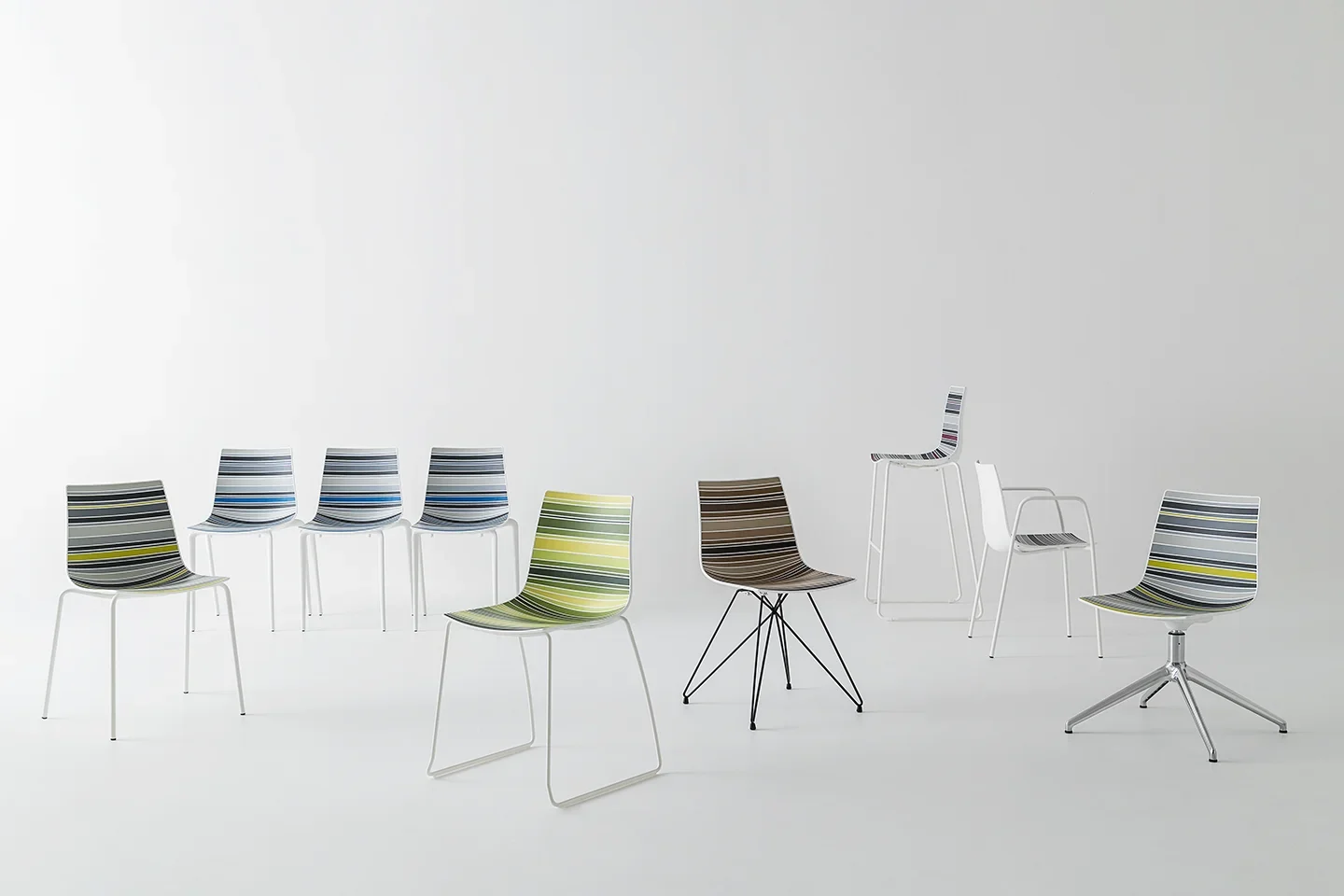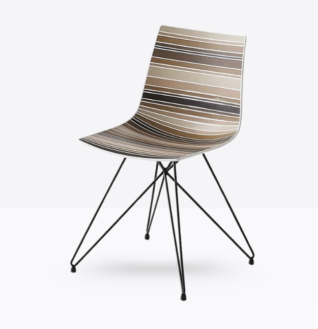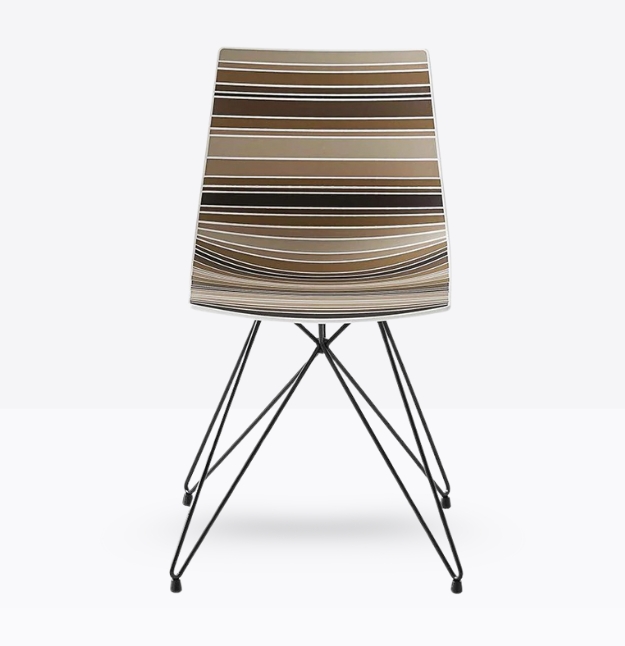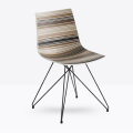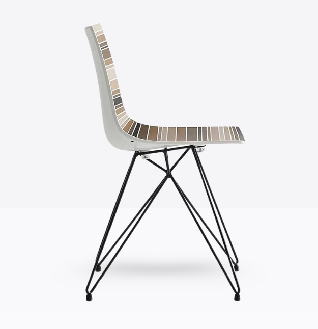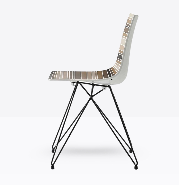 Sedia di design rivoluzionaria, caratterizzata da strisce sovrapposte di colori brillanti e pastello che creano una fantasia asimmetrica. Colorfive TSP utilizza la più avanzata tecnologia di iniezione plastica e con il suo stile prêt à porter, e le varie colorazioni a disposizione, si abbina perfettamente a qualsiasi ambiente indoor e outdoor. La struttura a tralifficio in filo è realizzata in metallo, disponibile sia verniciata bianca o nera (anche per uso esterno) che cromata (solo per uso interno)
