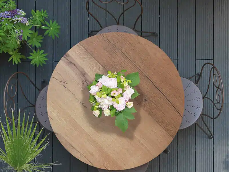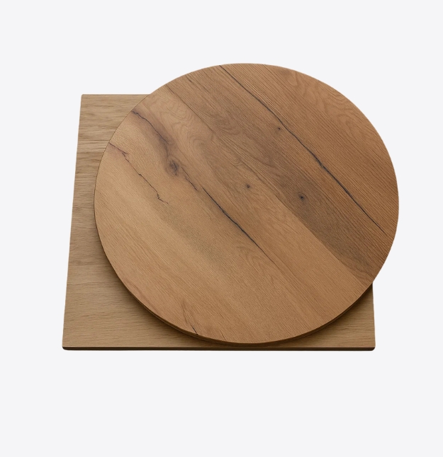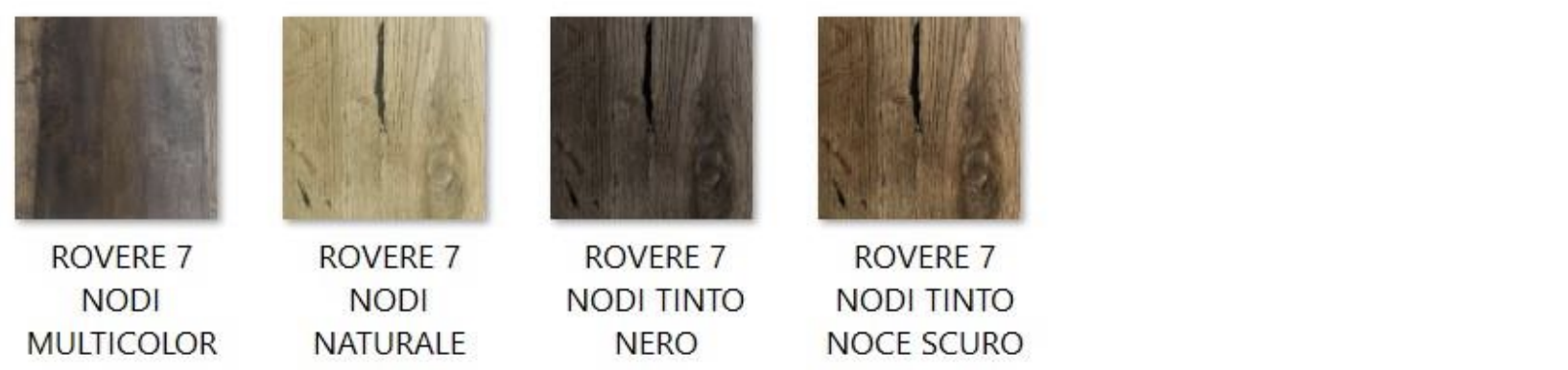 Legno listellare, placcato con lastrone in rovere 7 nodi, caratteristico per la sua nodosità e le stuccature in contrasto. Finito con vernice atossica all’acqua, zero gloss, per mantenere l’effetto naturale della superficie.