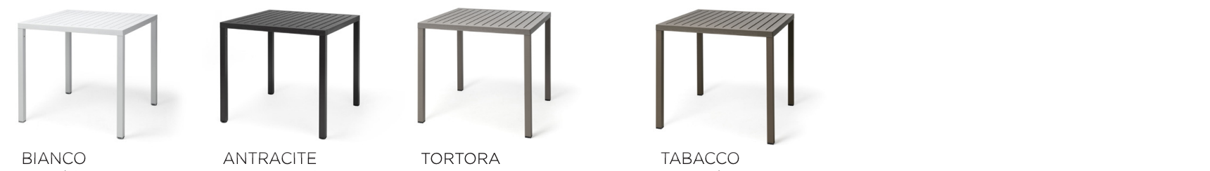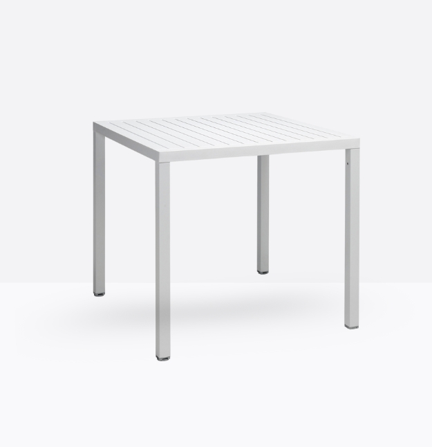 Cube 80, Tavolo impilabile 80X80 cm. Materiale: piano DurelTOP in polipropilene trattato anti-UV, colorato in massa. Gambe in alluminio verniciato. Finitura opaca. Dotato di piedini regolabili. Resina riciclabile.*piano tavolo incluso