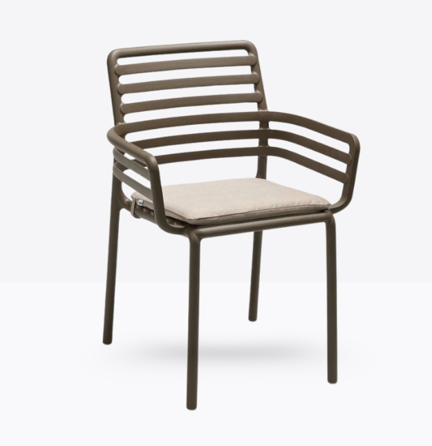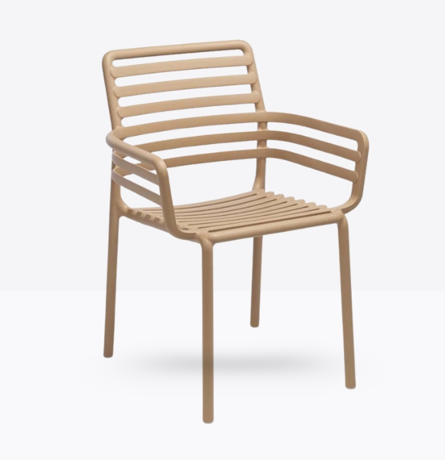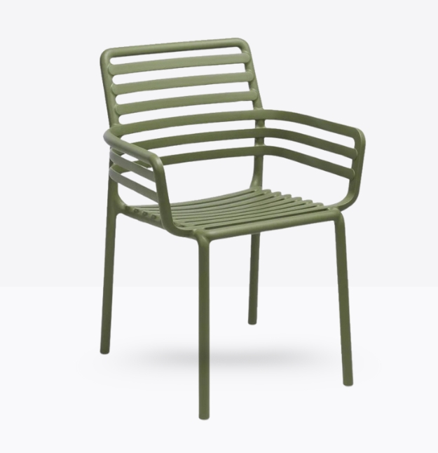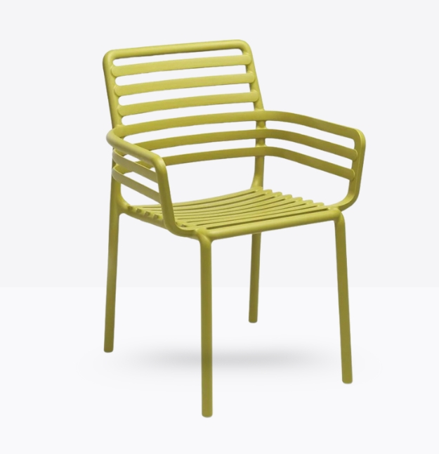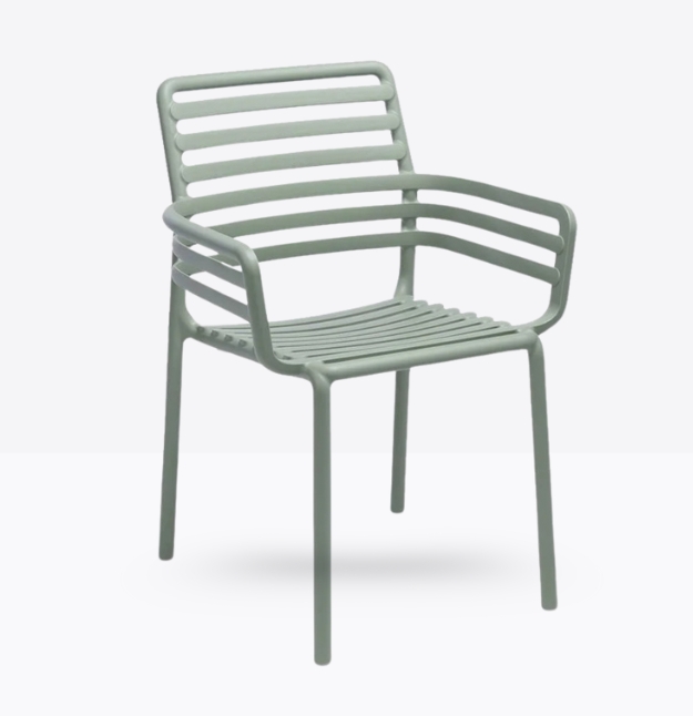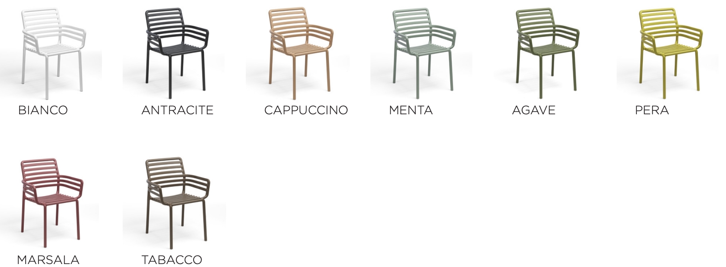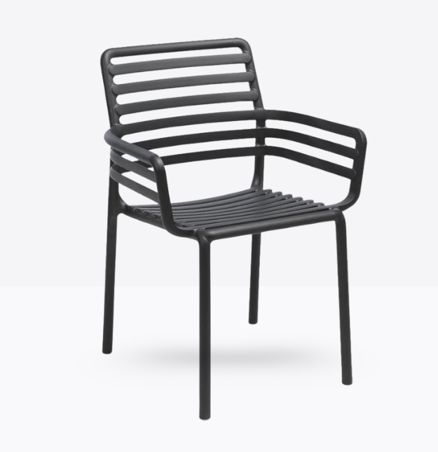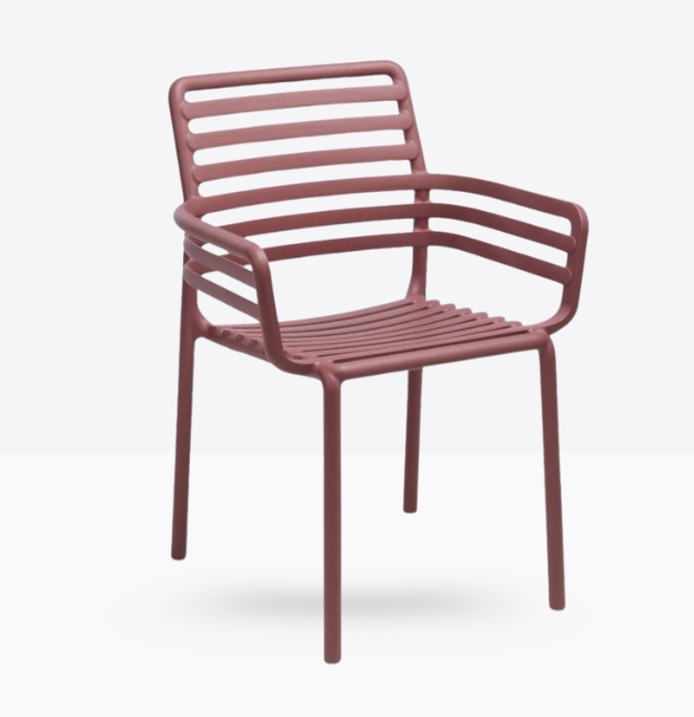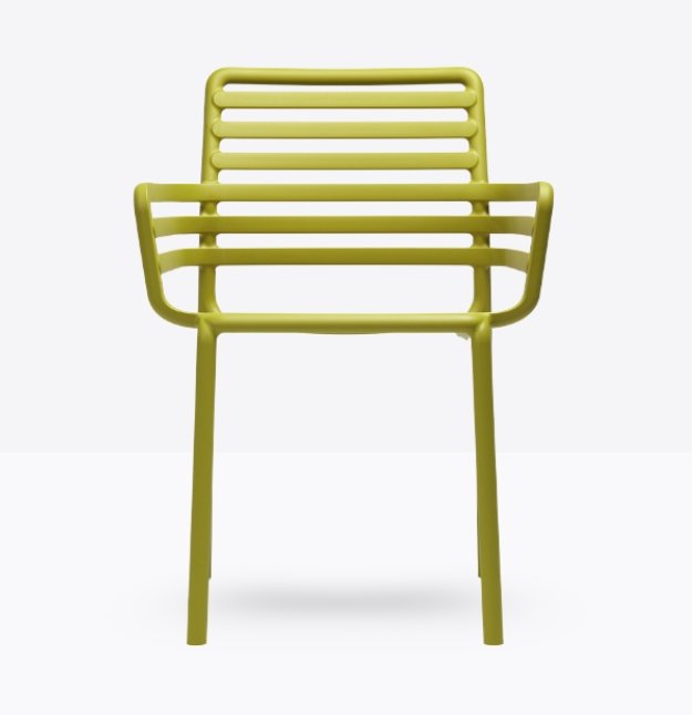 poltroncina monoblocco con braccioli Doga P. Materiale: polipropilene fiberglass trattato anti-UV e colorato in massa. Impilabile. Finitura opaca.
