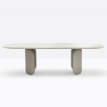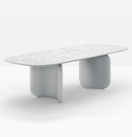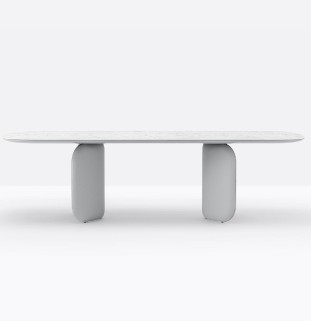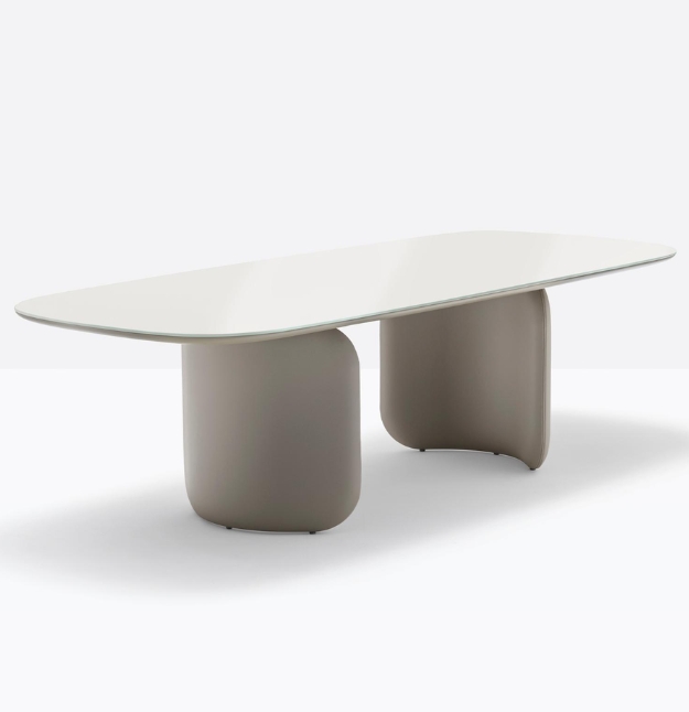 Elinor 300 è caratterizzata da forme morbide e sinuose, è raffinata e contemporanea. Tavolo con base costituita da due elementi sagomati di dimensione fissa realizzati in poliuretano rigido e rivestiti in pelle, ripiano quadrato in stratificato ultrasottile di 6 mm o in vetro bianco e sottopiano in MDF laccato dalla forma bombata, che nasconde la parte strutturale in acciaio..*piano tavolo incluso