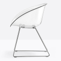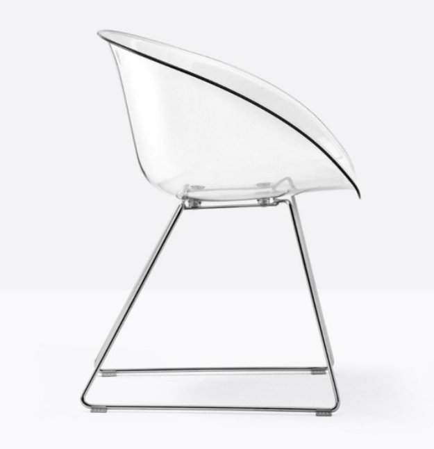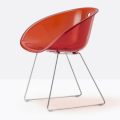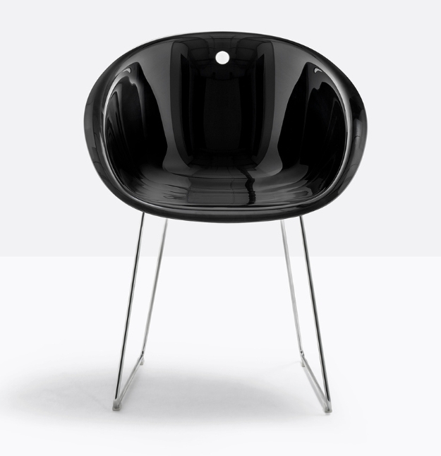 La poltroncina Gliss 921 ha una forma avvolgente ed ergonomica che si ispira alle sedute iconiche degli anni Cinquanta e si connota per l’elemento distintivo del foro sulla scocca. struttura a slitta in tondino d’acciaio Ø 10 mm.