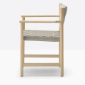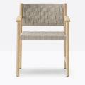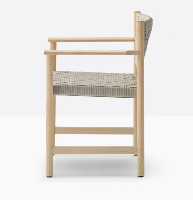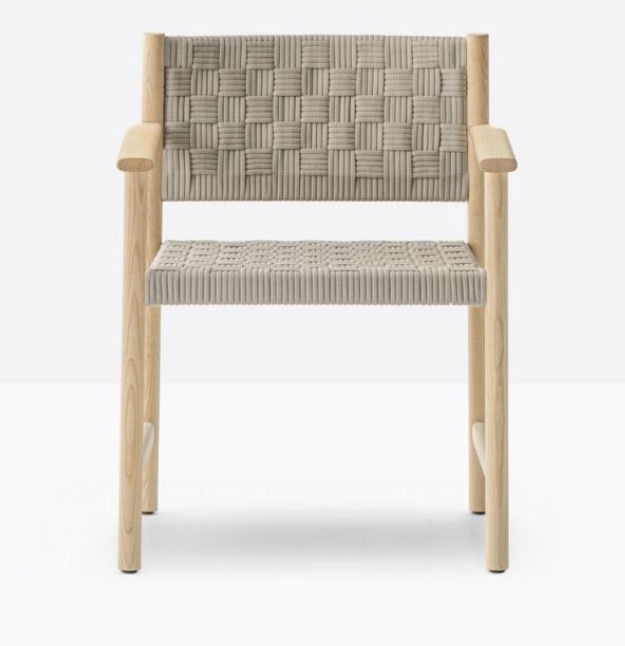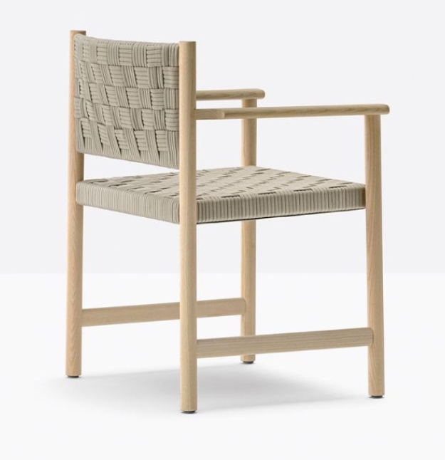 Poltroncina Griante 3795. Le gambe cilindriche sono tornite e un bracciolo a sezione ellittica si caratterizza per un delicato alleggerimento in prossimità dell’innesto con la gamba posteriore. Il telaio in alluminio garantisce il supporto della seduta. Elemento distintivo è l’intreccio del sedile e dello schienale, realizzato a mano in Italia con un nastro in filato di polipropilene dalla texture tridimensionale, che assicura comfort e resistenza, oltre che essere completamente riciclabile e disassemblabile. Il design dell’intreccio si distingue per l’uso ripetuto della geometria del quadrato, ripreso anche nelle proporzioni generose del sedile, che conferisce un aspetto elegante e ricercato e allo stesso tempo accogliente.