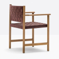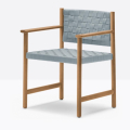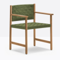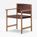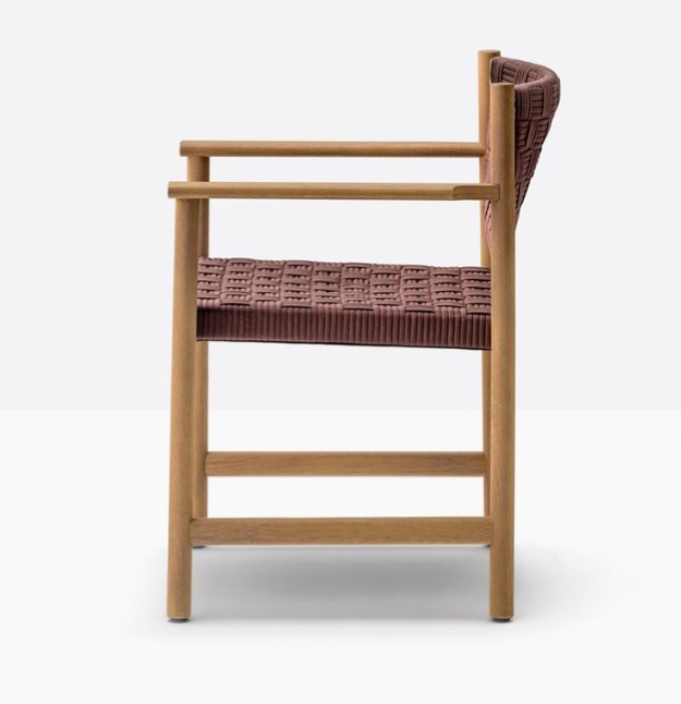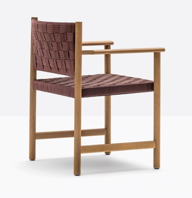 Poltroncina Griante 3805. Le gambe cilindriche sono tornite e un bracciolo a sezione ellittica si caratterizza per un delicato alleggerimento in prossimità dell’innesto con la gamba posteriore. Il telaio in alluminio garantisce il supporto della seduta. Elemento distintivo è l’intreccio del sedile e dello schienale, realizzato a mano in Italia con un nastro in filato di polipropilene dalla texture tridimensionale, che assicura comfort e resistenza, oltre che essere completamente riciclabile e disassemblabile. Il design dell’intreccio si distingue per l’uso ripetuto della geometria del quadrato, ripreso anche nelle proporzioni generose del sedile, che conferisce un aspetto elegante e ricercato e allo stesso tempo accogliente.
