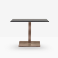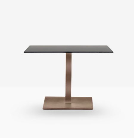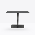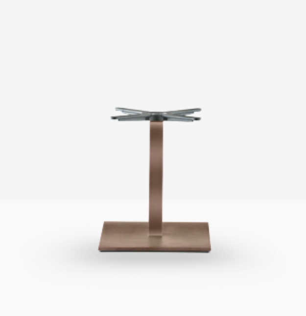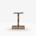 Inox 4402/50, base centrale quadrata in ghisa sabbiata, colonna e copribase in acciaio inox. Ripiano quadrato disponibile in diverse dimensioni e finiture. * piano tavolo escluso