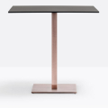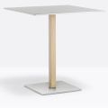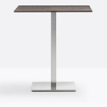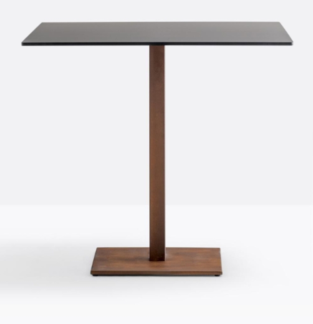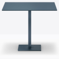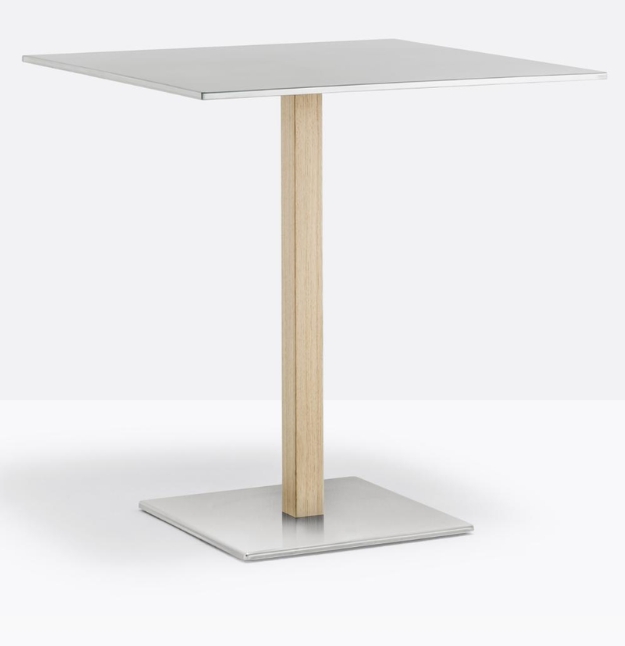Inox 4402, base centrale quadrata in ghisa sabbiata, colonna e copribase in acciaio inox. Ripiano quadrato disponibile in diverse dimensioni e finiture. * piano tavolo escluso