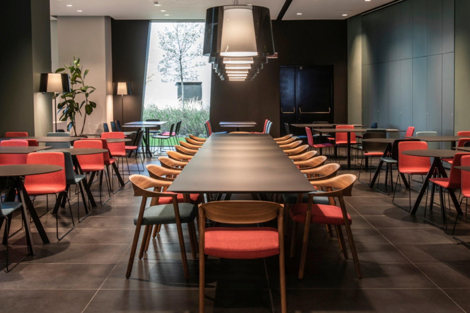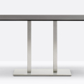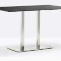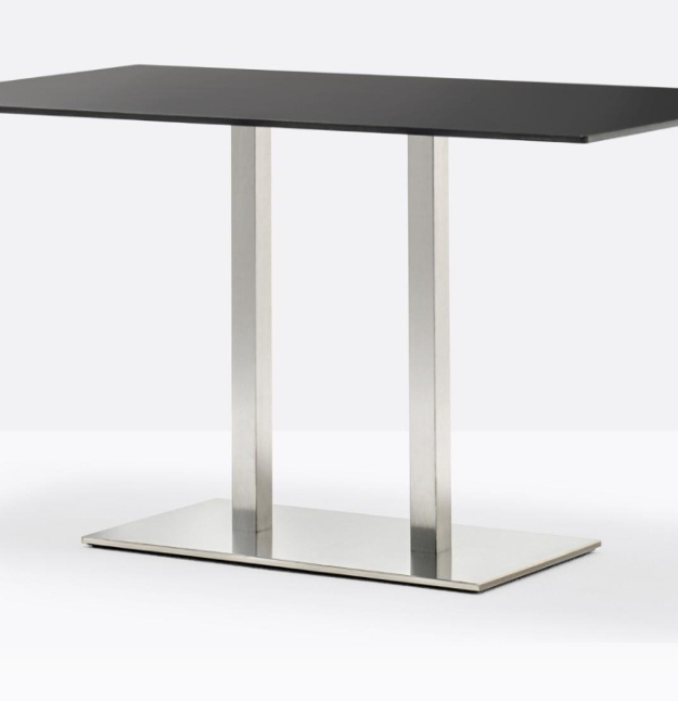 Inox 4467, base centrale rettangolare in ghisa sabbiata, colonna e copribase in acciaio inox. Ripiano rettangolare disponibile in diverse dimensioni e finiture. * piano tavolo escluso