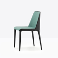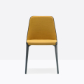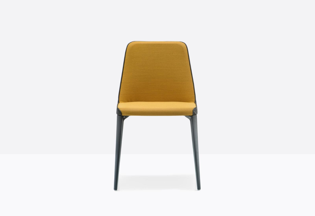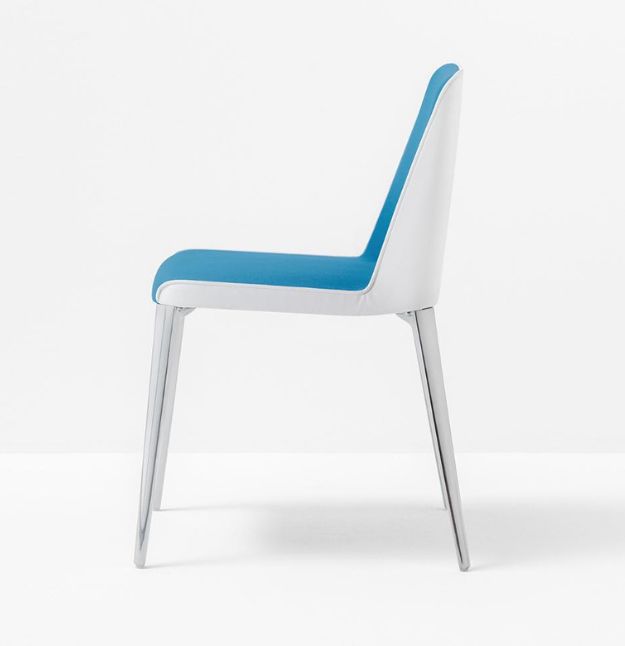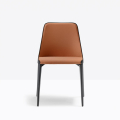 mod. Laja 880 con struttura in acciaio e seduta formata da cinghie elastiche incrociate, immerse in schiuma di poliuretano espanso, con schienale leggermente elastico ed accogliente. I rivestimenti possono essere in pelle o tessuto e la vasta gamma di colori permette rivestimenti monocromatici o combinazioni bicromatiche. Le gambe possono essere verniciate in colori coordinati con i rivestimenti o in alluminio lucidato.