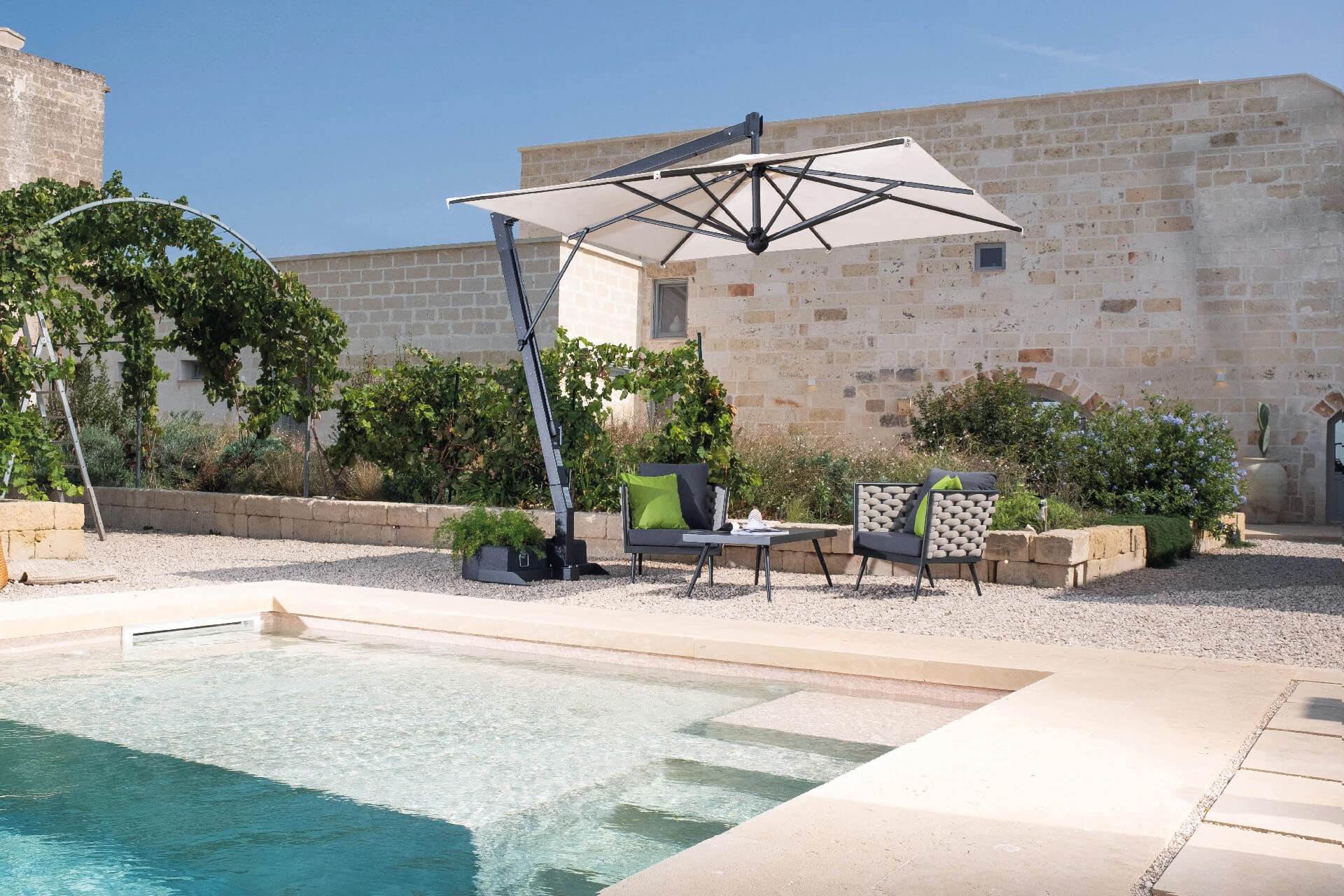 L’ombrellone Leonardo Braccio a braccio in alluminio verniciato a polveri epossidiche colore grigio antracite. Molto apprezzato da sempre per la struttura robusta e adatta per un uso intenso professionale. * base esclusa