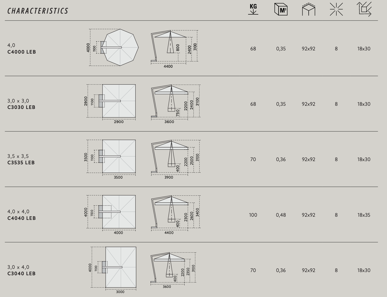 | Copertura max | 400×400 cm / Diametro 400 cm |