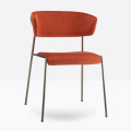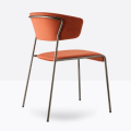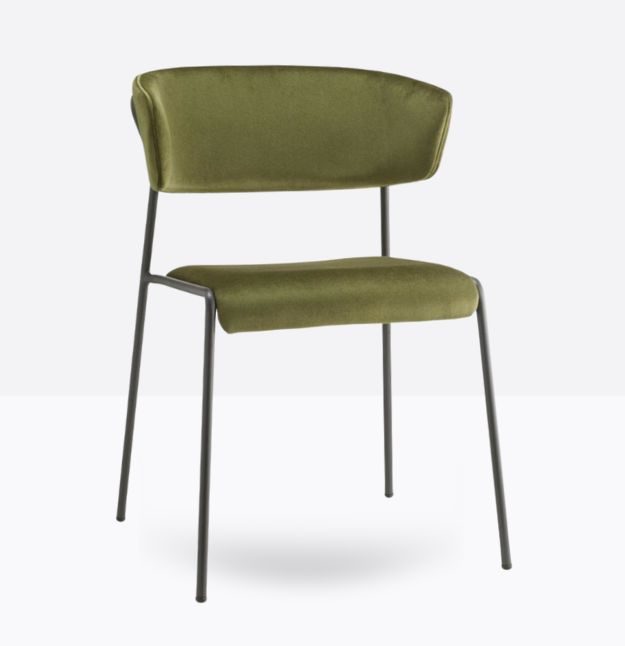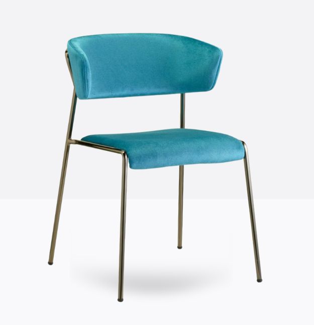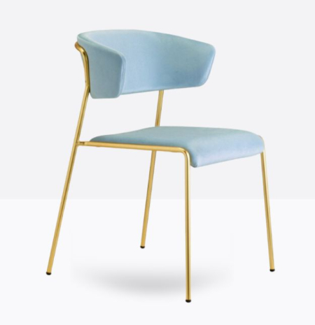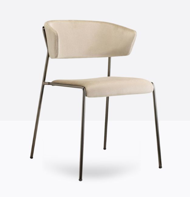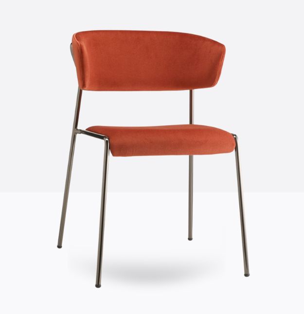 la sedia Lisa con Braccioli si ispira alle atmosfere eleganti degli interni anni ’50 e ’60. Il sottile telaio tubolare contorna e sostiene lo schienale di poltroncine e sedie, con seduta e schienale imbottito.
