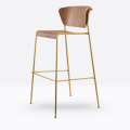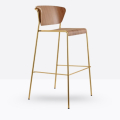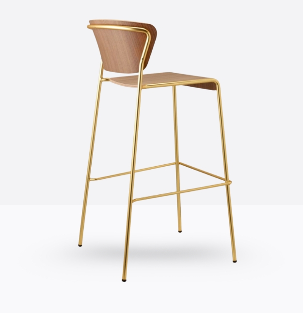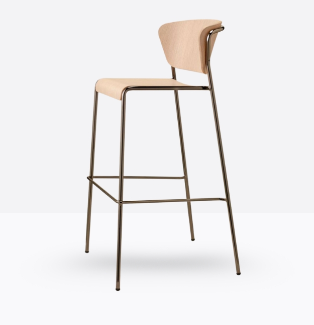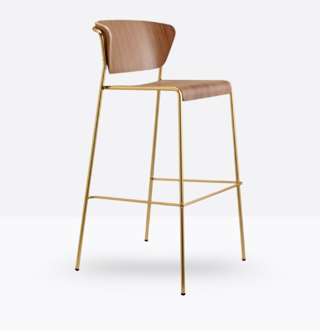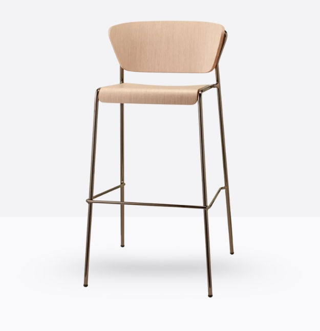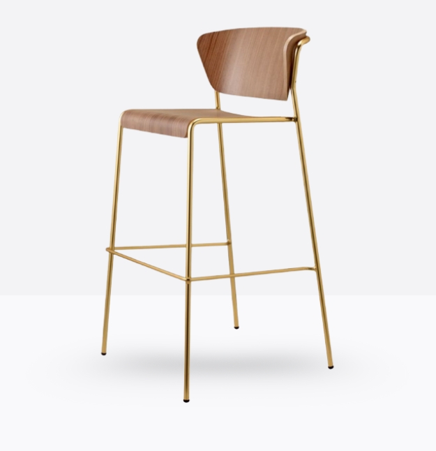 lo sgabello Lisa Wood si ispira alle atmosfere eleganti degli interni anni ’50 e ’60. Il sottile telaio tubolare contorna e sostiene lo schienale di poltroncine e sedie, con seduta e schienale in legno.