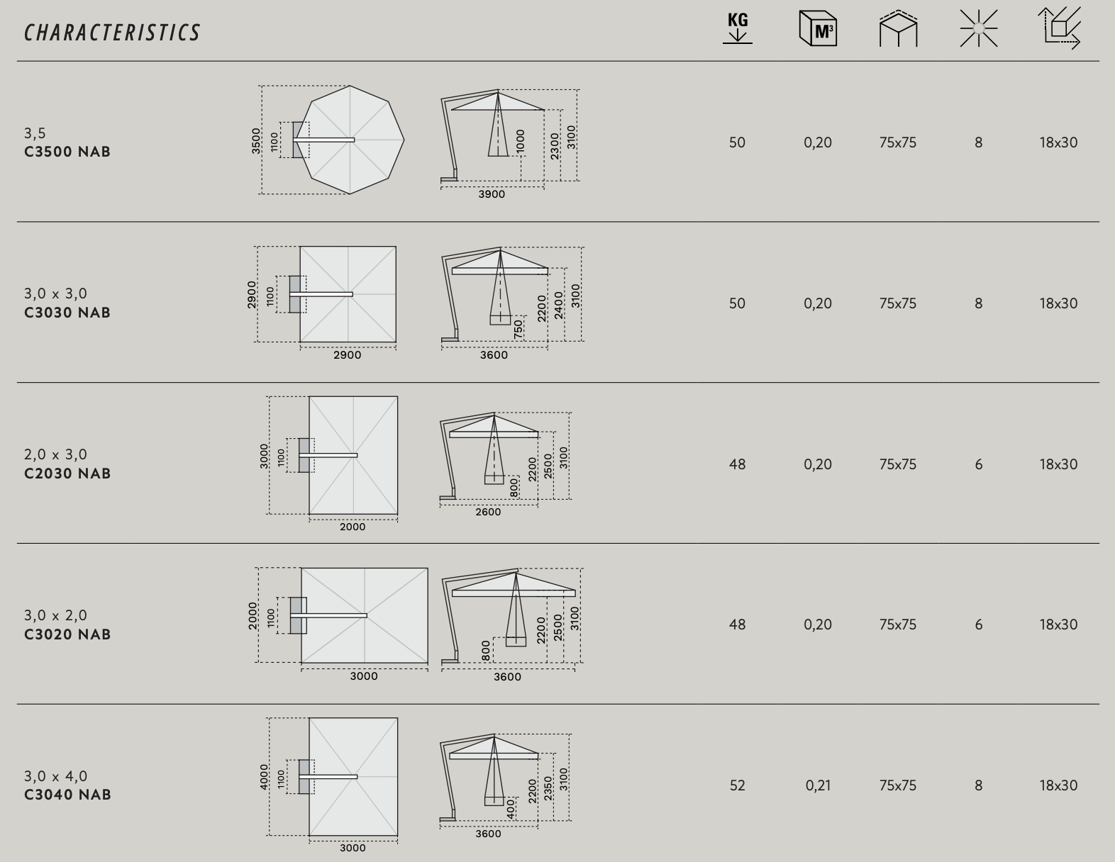 | Copertura max | 400×300 cm / Diametro 350 cm |