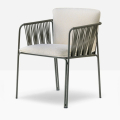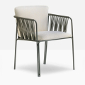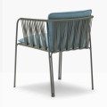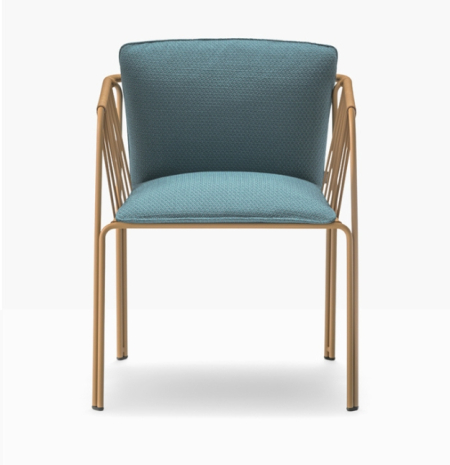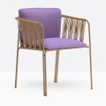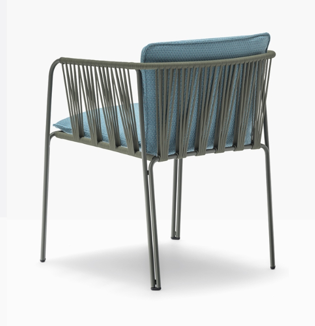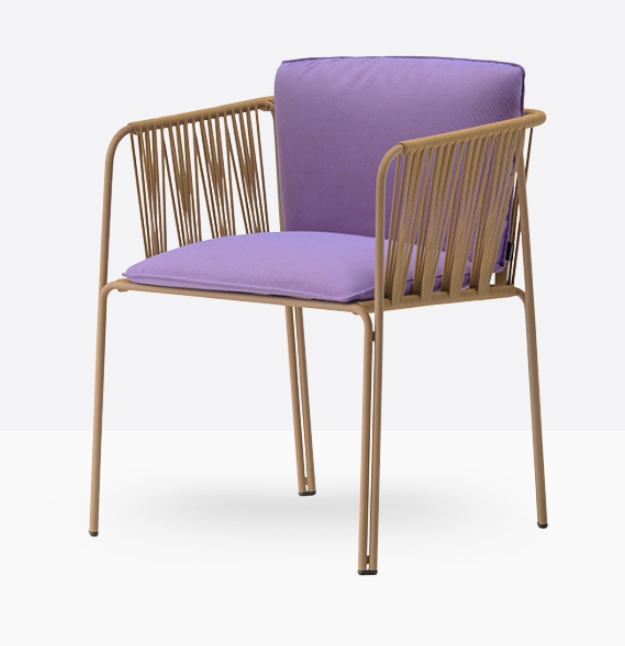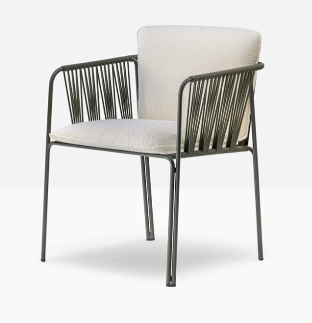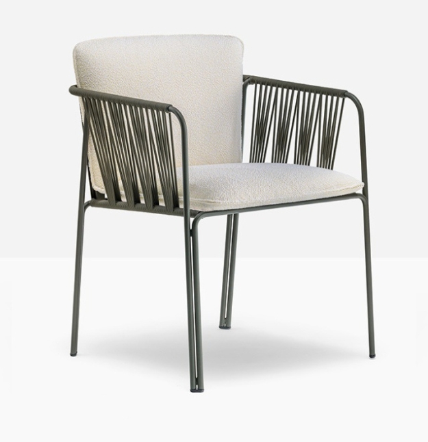 Poltrona narì 6360 con struttura in acciaio e intreccio realizzato in estruso di PVC con anima in nylon che avvolge i braccioli e lo schienale. L’incordatura, realizzata in Italia da esperti artigiani, si stringe nella parte inferiore della seduta e si allarga verso l’alto per richiamare una geometria a ventaglio. La seduta e lo schienale accolgono un cuscino in schiumato poliuretanico composto da due sezioni unite da una zip, che appoggia su una seduta con doghe in acciaio. Le gambe sono caratterizzate da un doppio tubo d’acciaio dalla forma lineare e semplice.