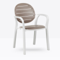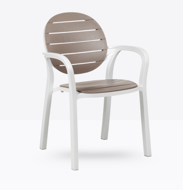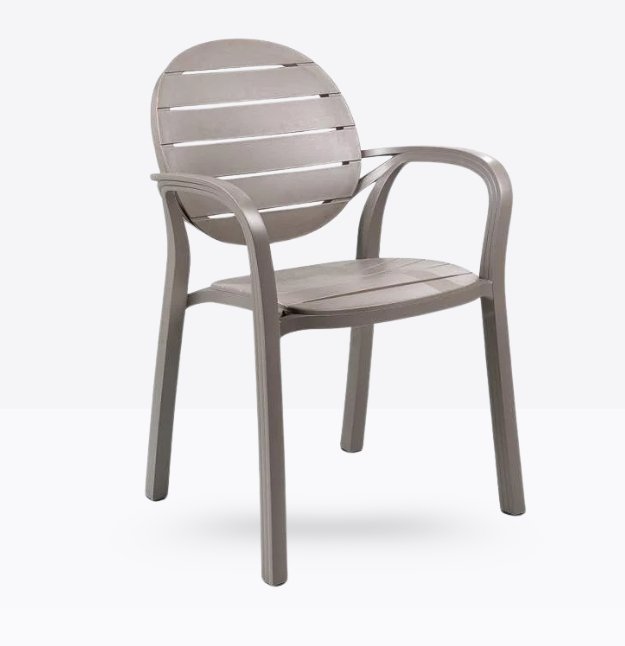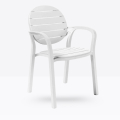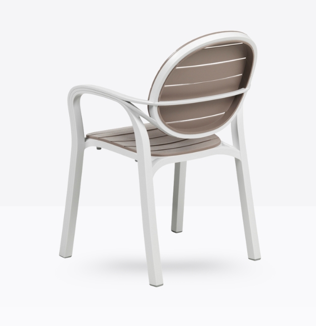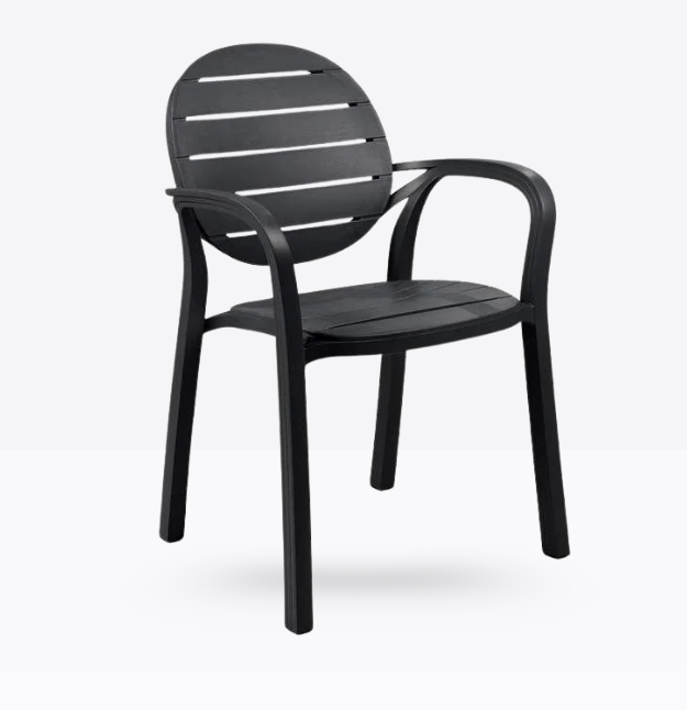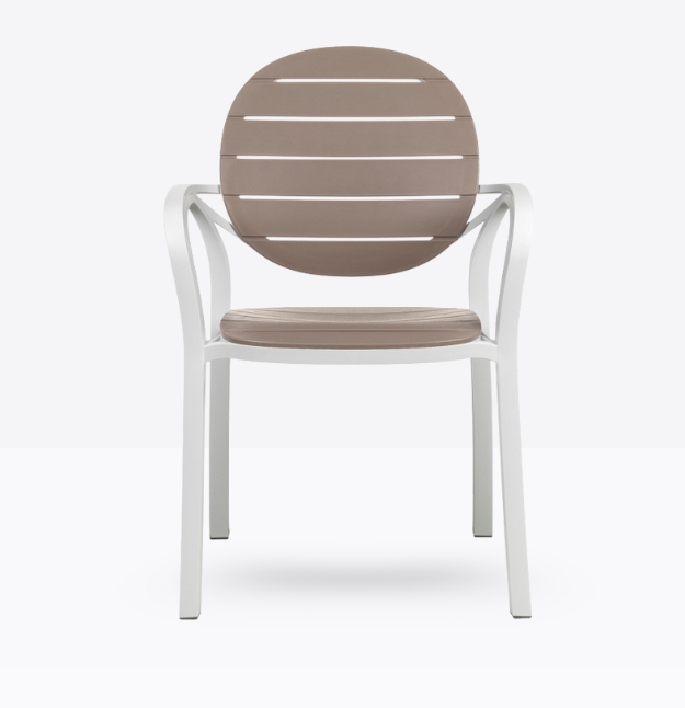 Seduta in resina fiberglass dal linguaggio contemporaneo, Palma P con seduta e schienale disegnati da ampie doghe. Le gambe si diramano in fasci sottili tangenti a seduta e schienale. Leggera e impilabile.