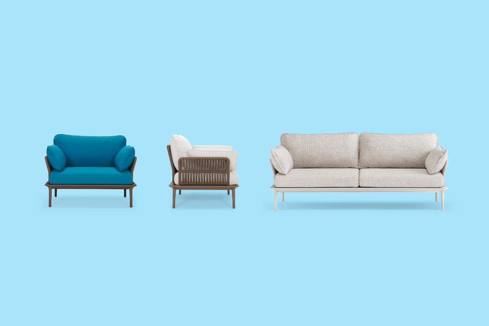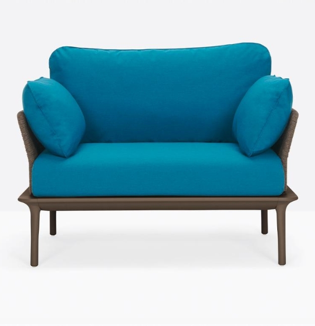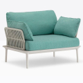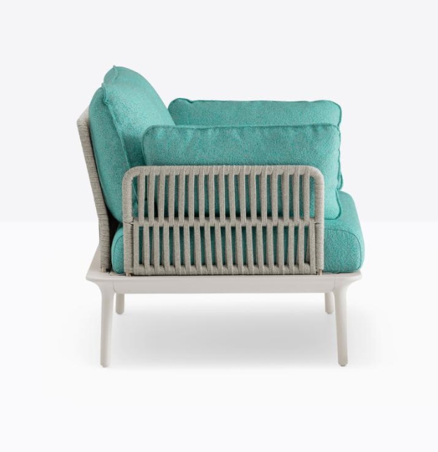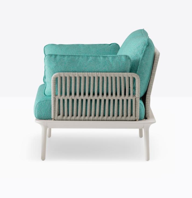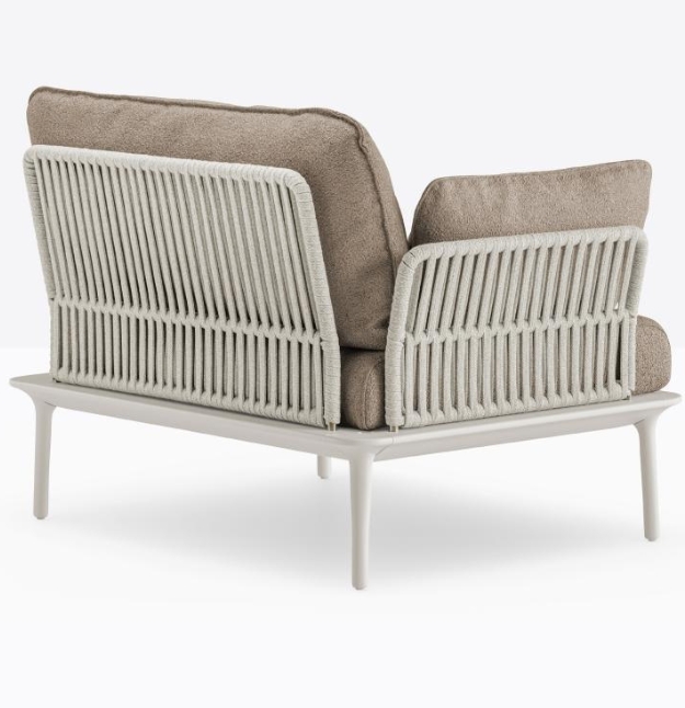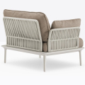 Poltrona lounge Reva Twist 2P con quattro gambe affusolate in pressofusione d’alluminio poste alle estremità della cornice perimetrale in estruso di alluminio. Lo schienale e i braccioli in acciaio sono ricoperti da un intreccio realizzato con una corda piatta in polipropilene resistente agli agenti atmosferici. Cuscini in poliestere rivestiti in tessuto.