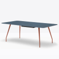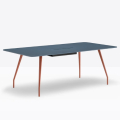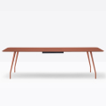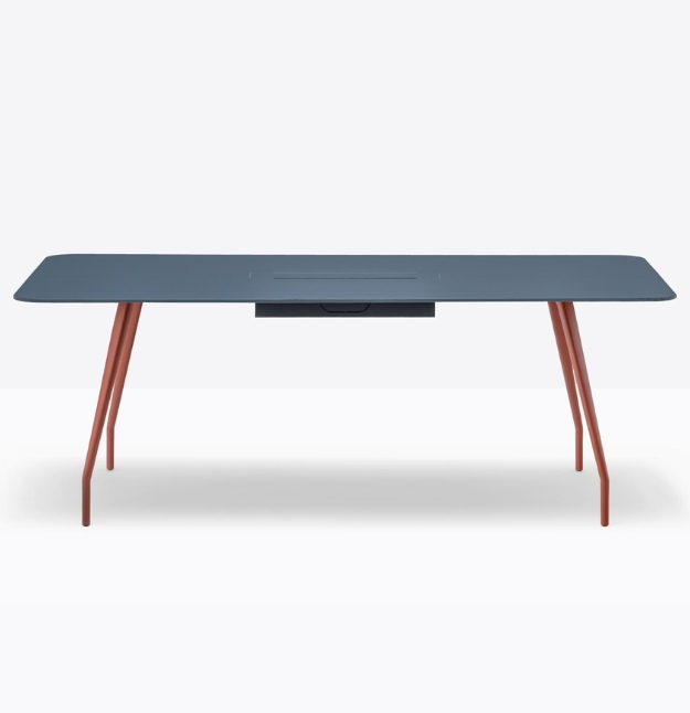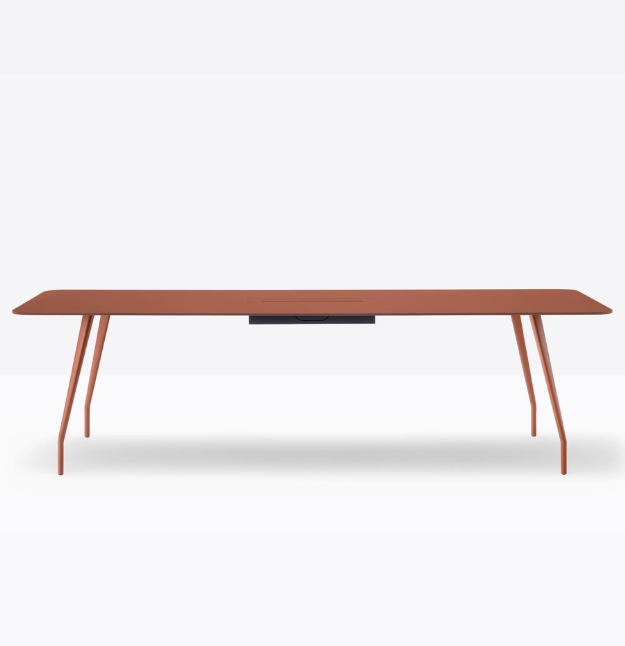 Rizz trz cc è un tavolo realizzato in alluminio che garantisce resistenza e leggerezza al tempo stesso. Elemento distintivo sono le gambe che si integrano ad una struttura portante in alluminio nascosta sotto il ripiano. Per sostenere ripiani di grandi dimensioni, nella parte centrale al di sotto del ripiano, è presente una colonna rettangolare con angoli stondati in acciaio che funge anche da passacavi.*piano tavolo incluso